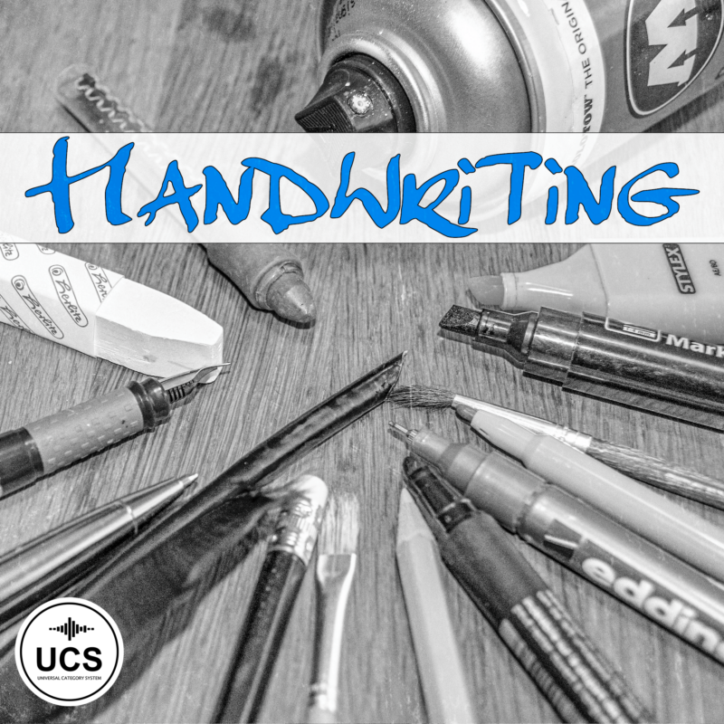 In this composite Sound Effects collection you get 841 files containing 2000+ of different handwriting sounds from different pens, pencils, crayons, chalk on blackboard, felt pens, markers, yes even brushes and writing in sand or carving in stone.